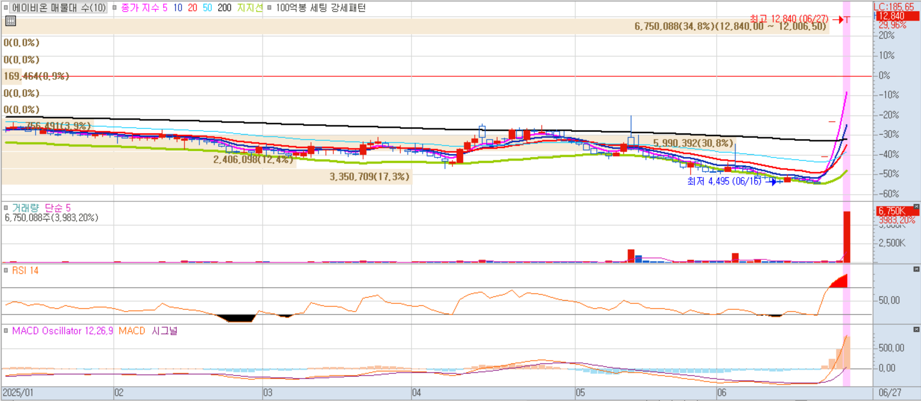 에이비온은 1조8000억원 규모의 항체의약품 기술 수출 소식에 힘입어 4거래일 연속 상한가를 기록했습니다. 오늘도 29.96% 급등하며 1만2840원에 거래되고 있으며, 강력한 상승 모멘텀을 유지 중입니다.