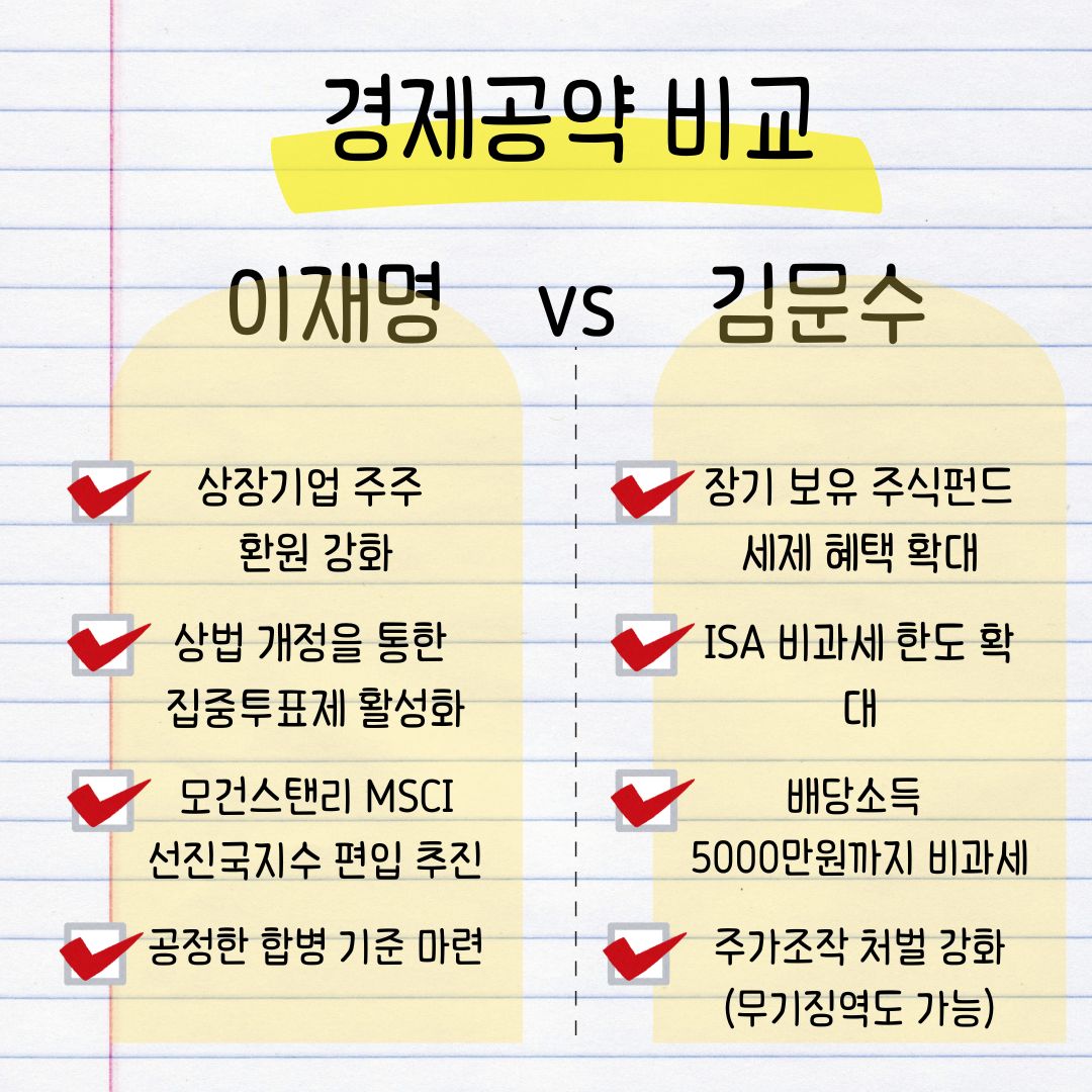 #해시태그: #이재명경제공약 #김문수경제공약 #대선공약비교 #증시활성화 #공정경제 #자유시장 #소액주주보호 #ISA혜택 #감세정책 #자산증식전략