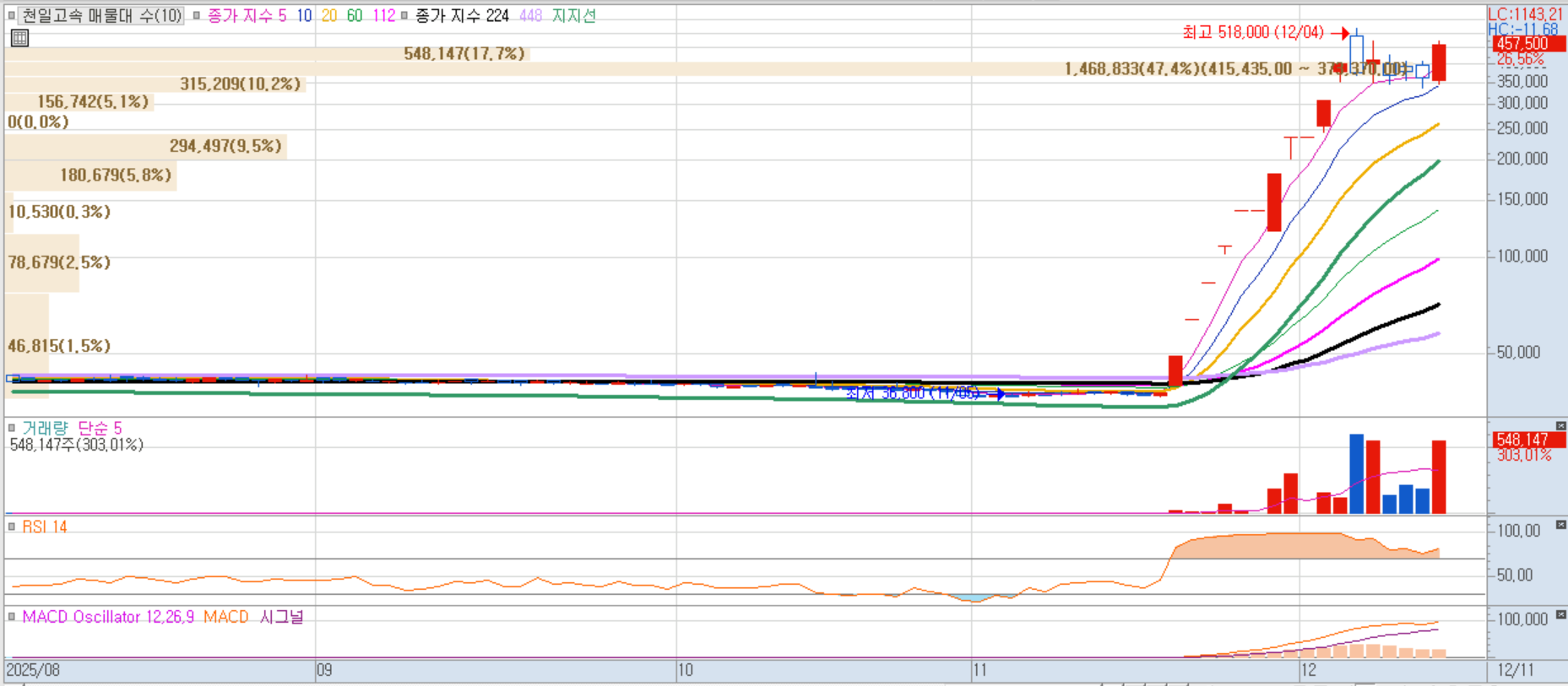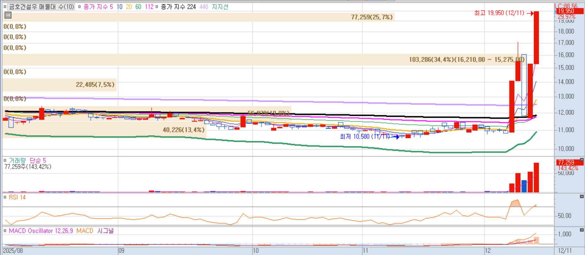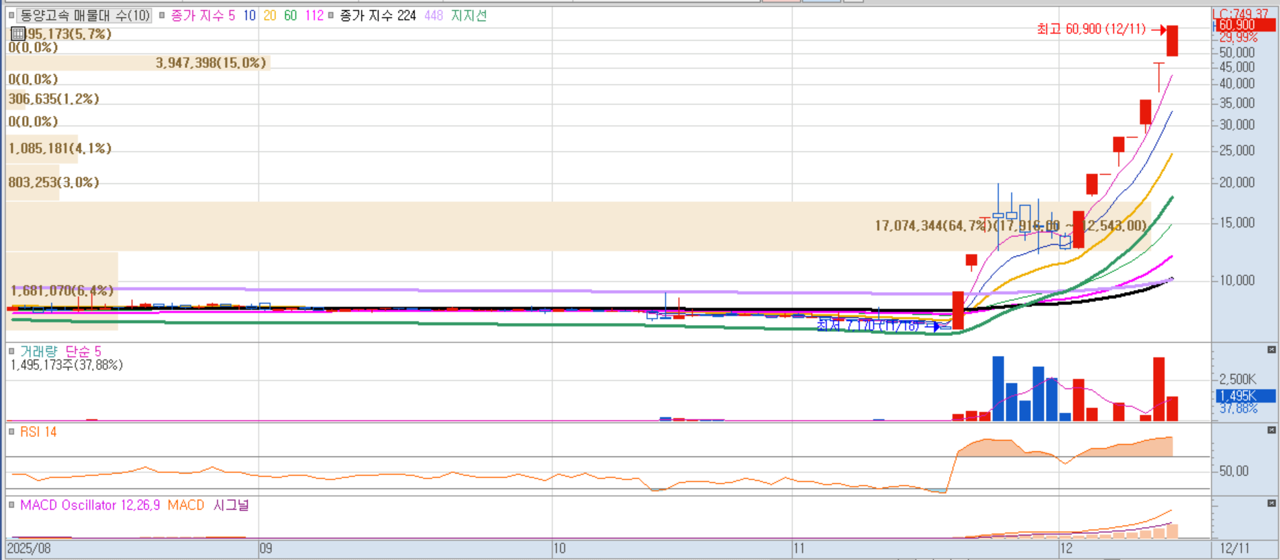 서울고속버스터미널 재개발 기대감이 6거래일 연속 강세를 이끎. 터미널 관련주 중 가장 강력한 모멘텀 유지.