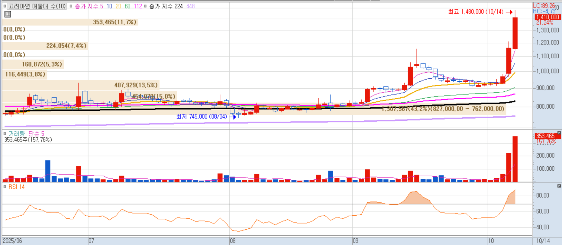 중국의 희토류 수출 통제와 함께 금값 상승세가 이어지며 금속·제련 기업 고려아연이 강세를 보였습니다.