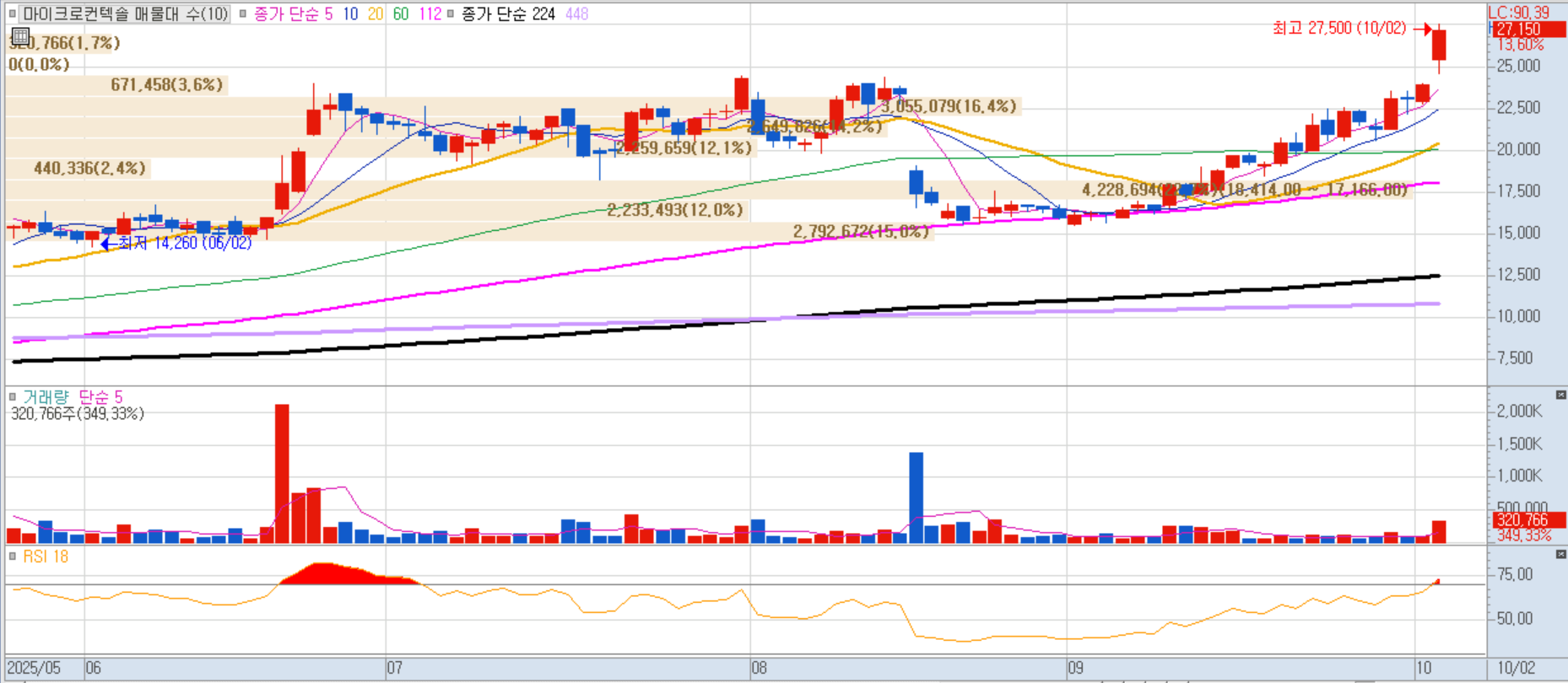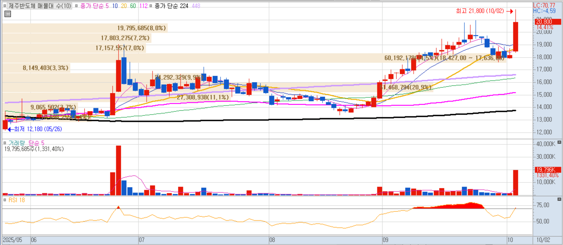 모바일 DRAM/Flash 팹리스. 반도체 밸류체인 전반 급등 흐름에 동조 상승.