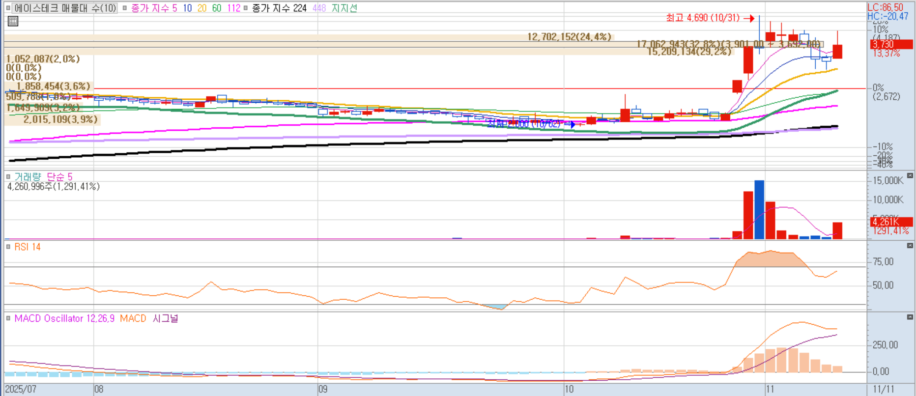 6G 통신장비 전문기업 에이스테크한미 간 통신 기술 협력 기대감으로 급등했습니다.