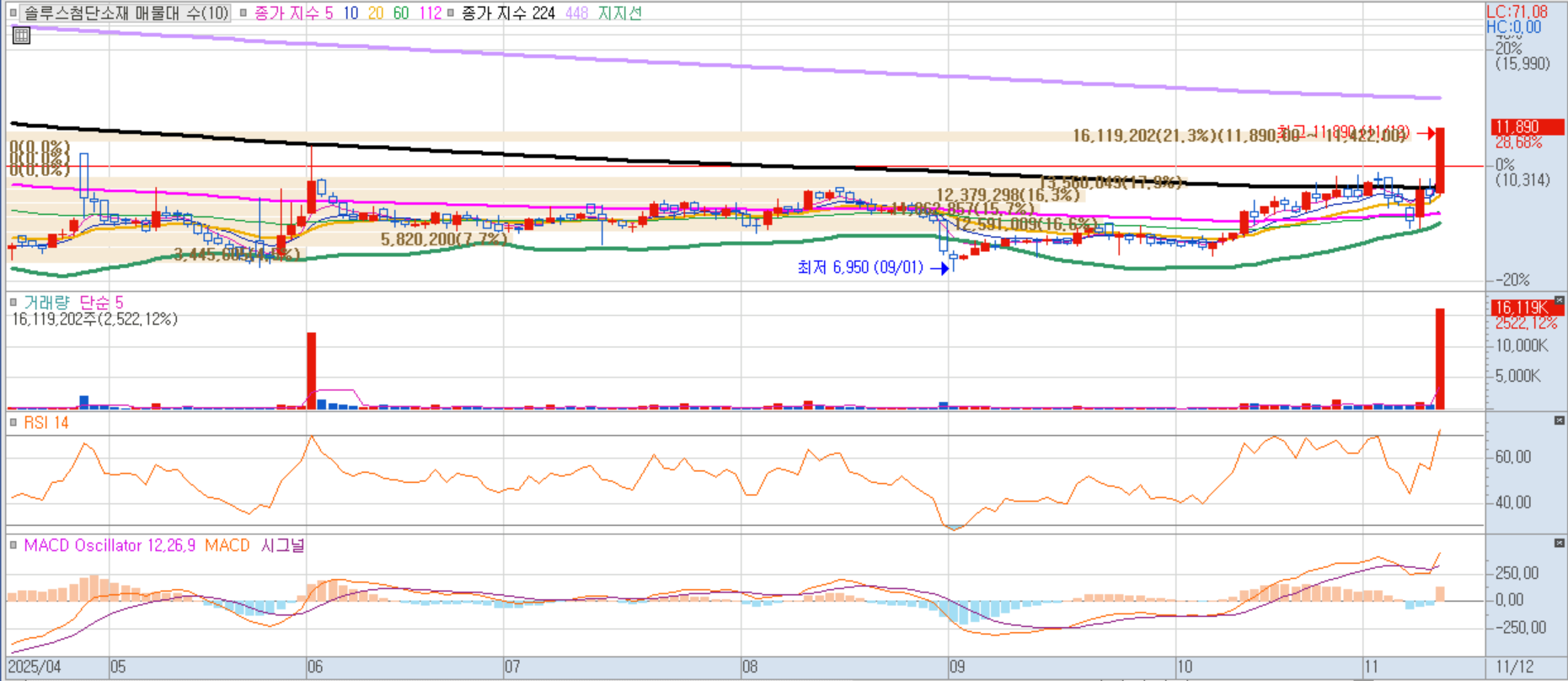 이차전지 및 OLED 소재 전문기업 솔루스첨단소재가 글로벌 전지박 시장 점유율 확대 전망에 급등했습니다.