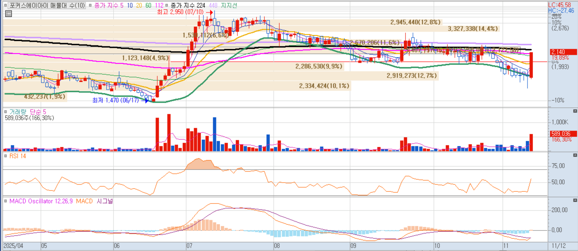 AI 기반 결제 솔루션 기업 포커스에이아이는 블록체인 전문기업 브이디크럭스, 비토즈와 함께 스테이블코인 결제 솔루션 개발 MOU 체결 소식에 급등했습니다.