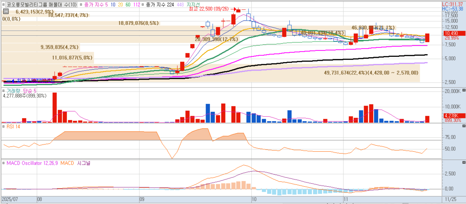 투자경고종목 해제 이후 수급 개선. 내년 1월 코오롱의 완전자회사 편입이 예정되어 지배구조 정비 기대감도 반영.