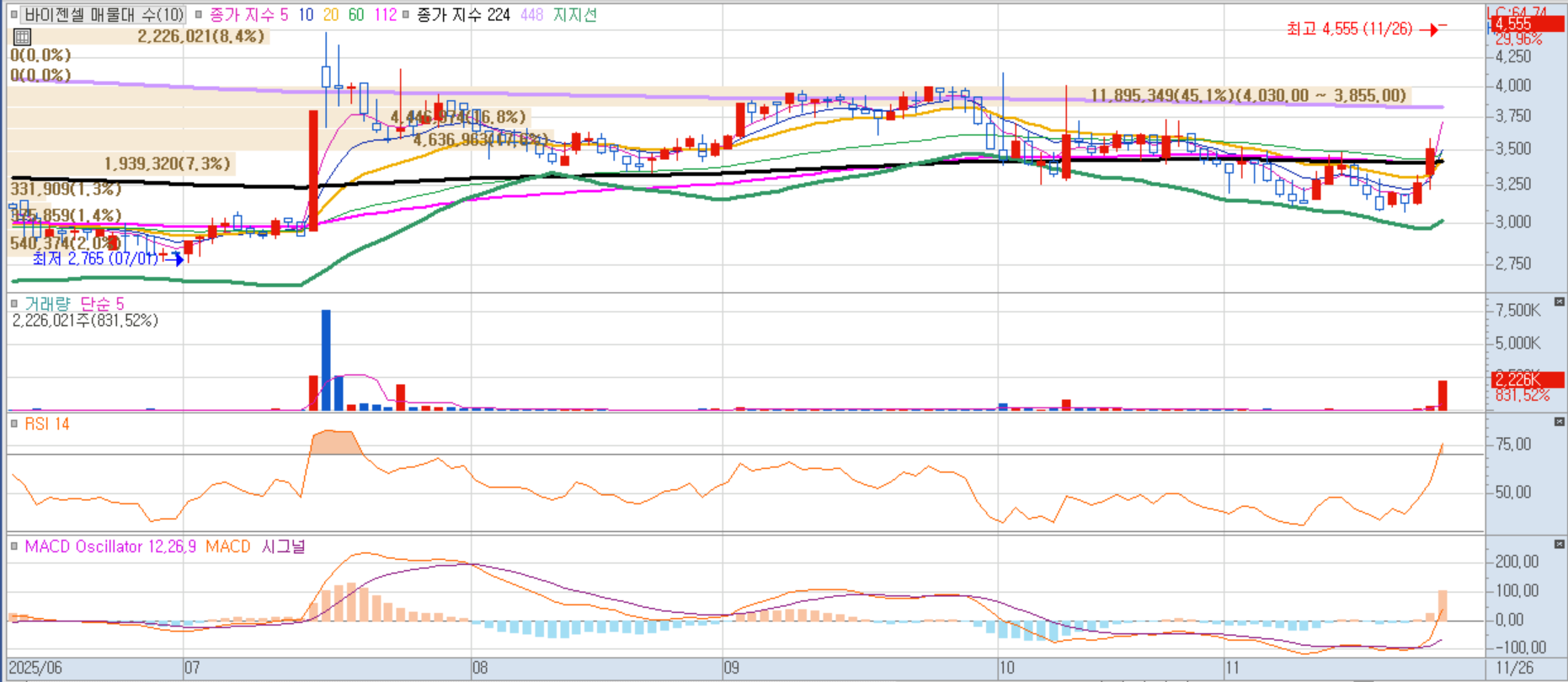 별도 공시 없이 급등. 국내 AI 신약개발사로 정부·대기업에서 기술력을 인정받고 있으며 새로운 플랫폼 기반의 신약 후보 개발 역량이 부각.