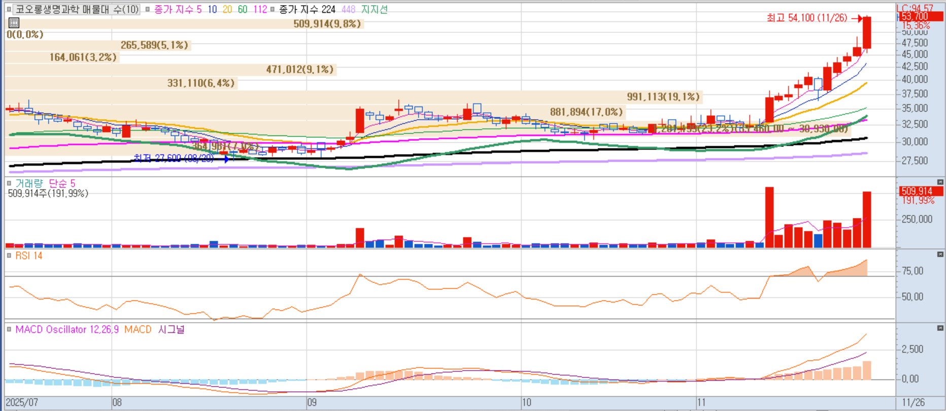 유가증권시장 신규 상장 후 3거래일 연속 상승. 글로벌 제약·바이오 경쟁력과 모회사 브랜드 신뢰도가 반영된 흐름.