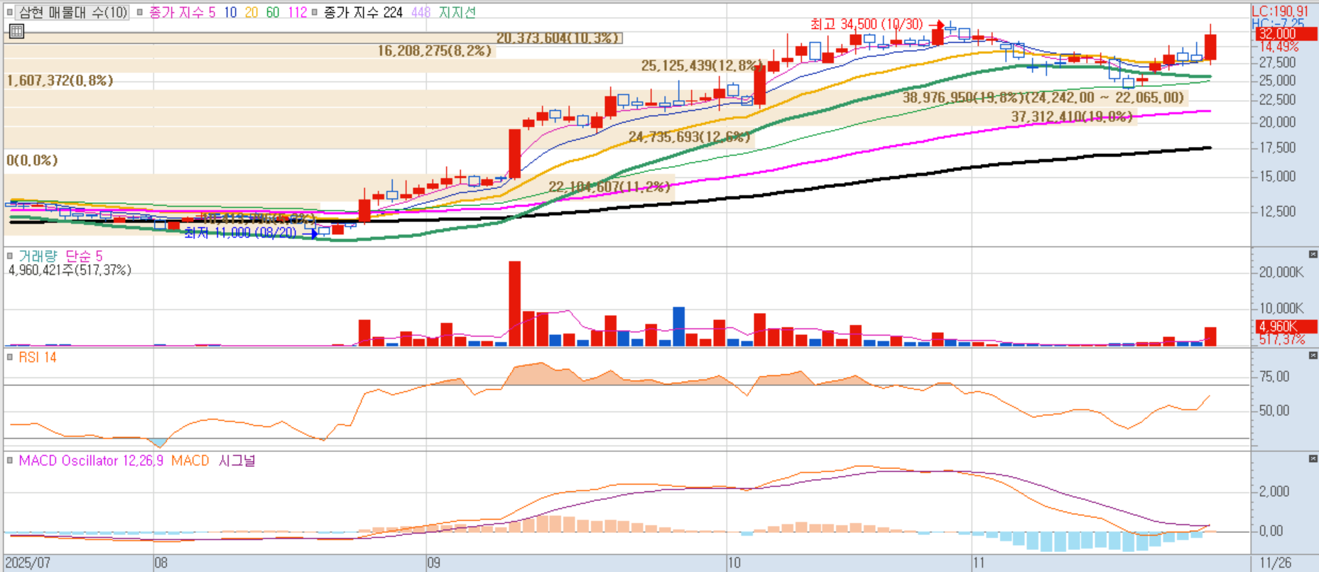 모션컨트롤 전문기업 삼현이 미국 빅테크 2곳과 휴머노이드 관련 수주 계약 임박 소식에 급등. 로봇·AI 융합 산업 성장 기대감이 강하게 반영.