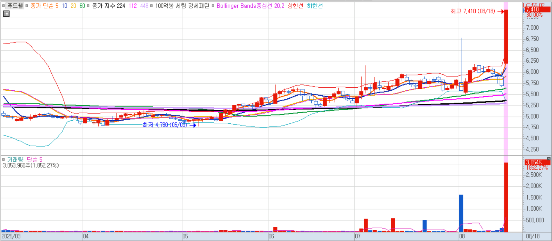 푸드웰은 2분기 실적 호조를 발표하며 주가가 급등했습니다. 영업이익 76억원(+98.3%), 매출액 898억원(+16.6%)으로 시장 예상치를 웃도는 성적을 내며 투자심리를 자극했습니다.