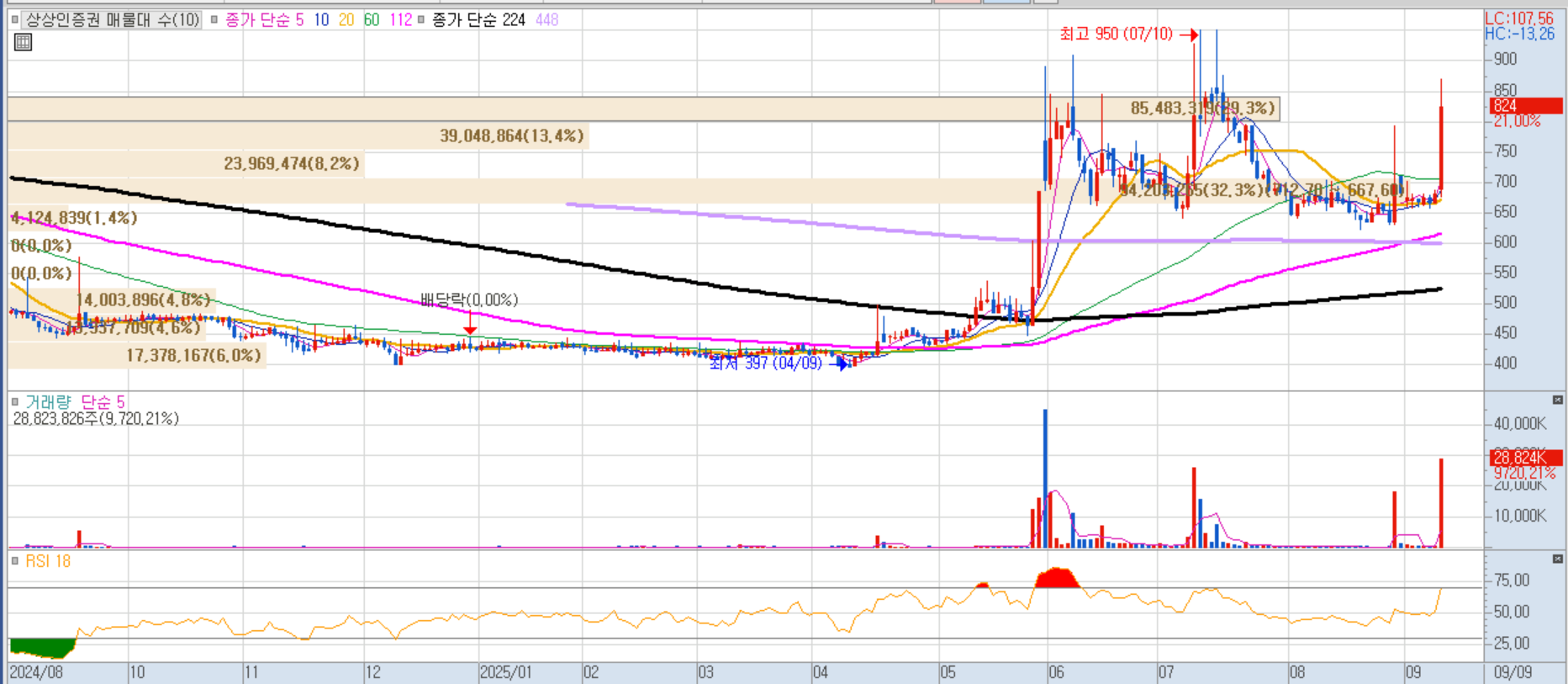 정부의 양도세 강화 정책 철회 가능성에 대한 기대감이 증권업계에 호재로 작용하며 증권주 전반에 매수세 유입, 상상인증권도 급등세를 보였습니다.