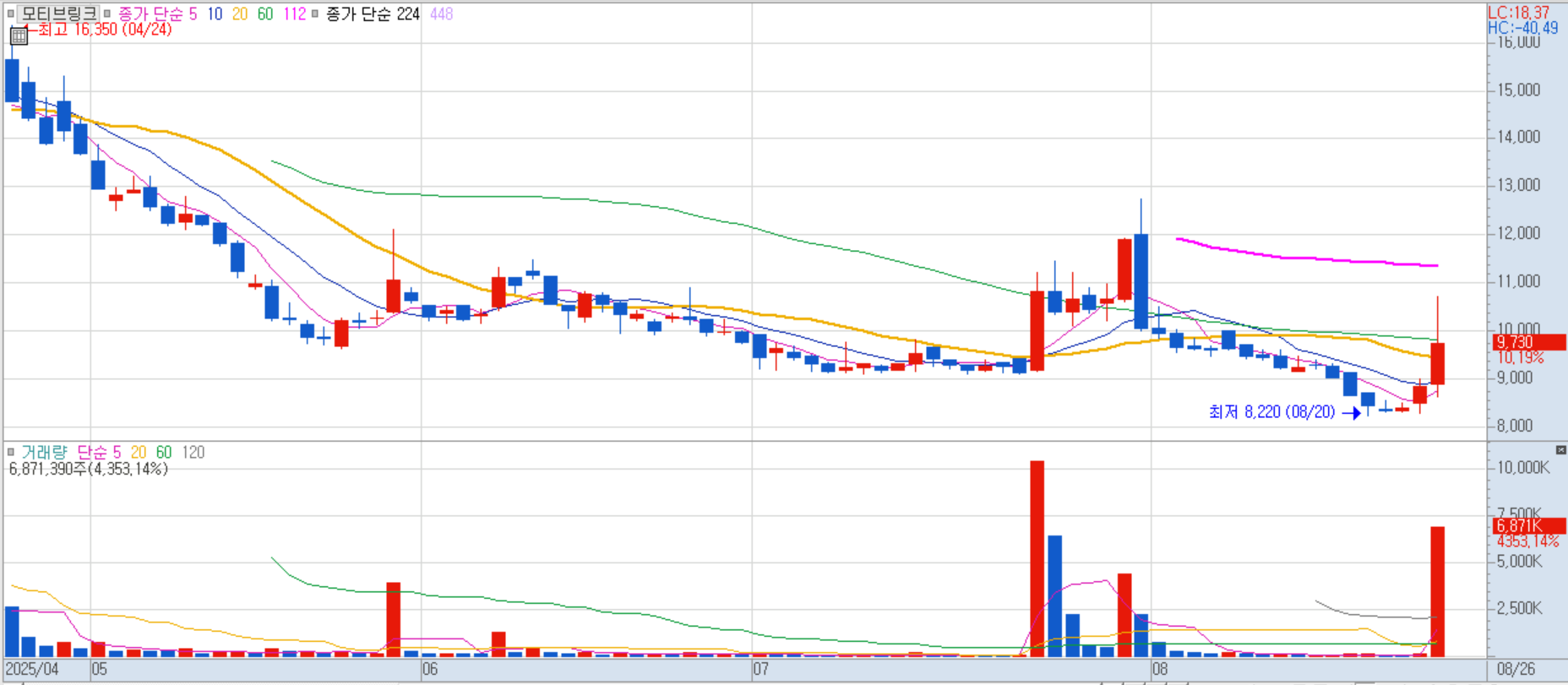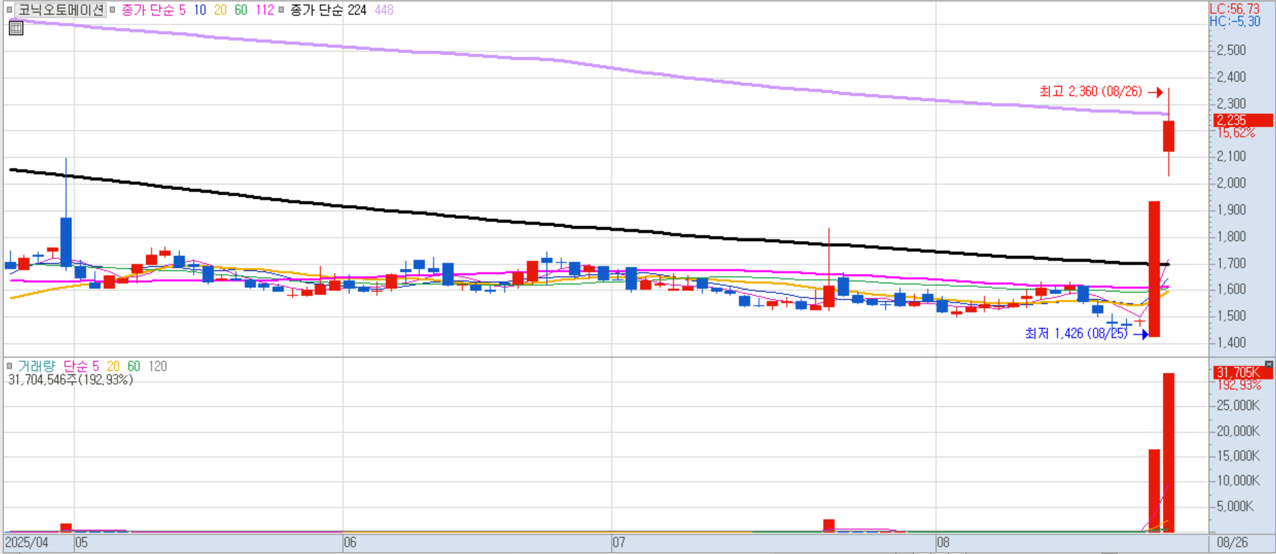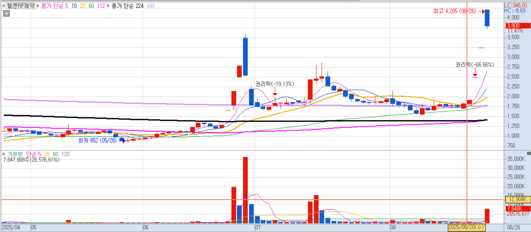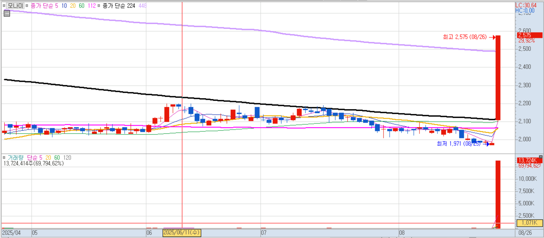무상증자 권리락 착시효과에 따른 투자 심리 자극으로 연일 급등세를 이어가고 있습니다. 주가가 저렴해 보이는 착시와 거래량 증가 기대감이 작용한 것으로 분석됩니다.