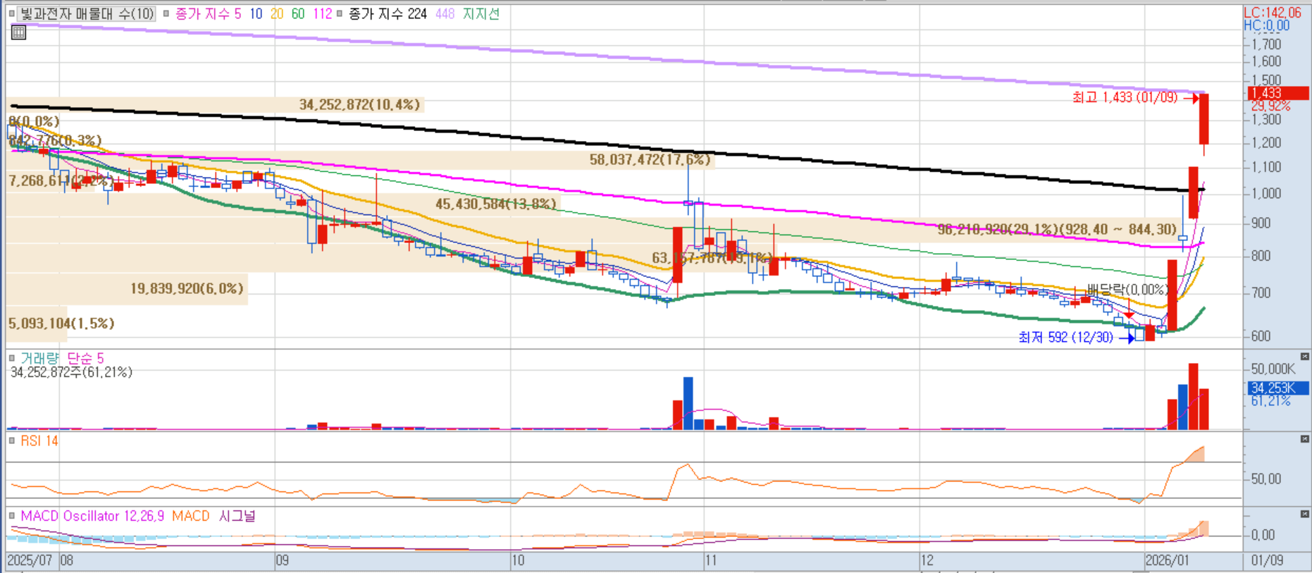 빛과전자가 차세대 초고속 광통신 핵심 부품으로 꼽히는 1.6T(테라비트)급 광트랜시버 개발을 완료했다고 밝히며 급등했습니다. 인공 지능 데이터센터와 초고속 네트워크 수요 확대 기대감이 반영된 모습입니다.