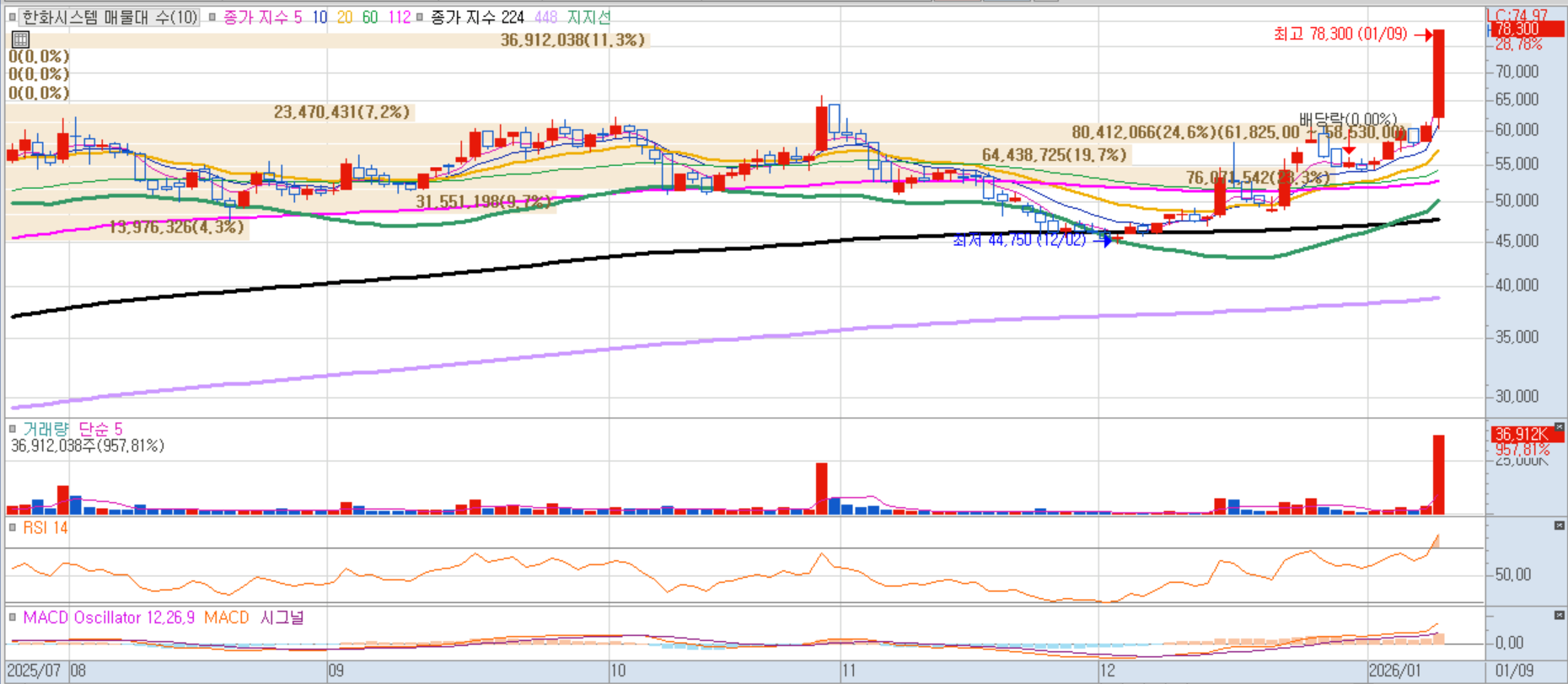 한화의 미국 조선소 확장 검토 소식에 조선-LNG-방산 관련주들이 전반적으로 상승했습니다. 특히 안정적인 LNG선 수주 기반을 확보한 한국카본이 수혜주로 부각되며 급등했습니다.