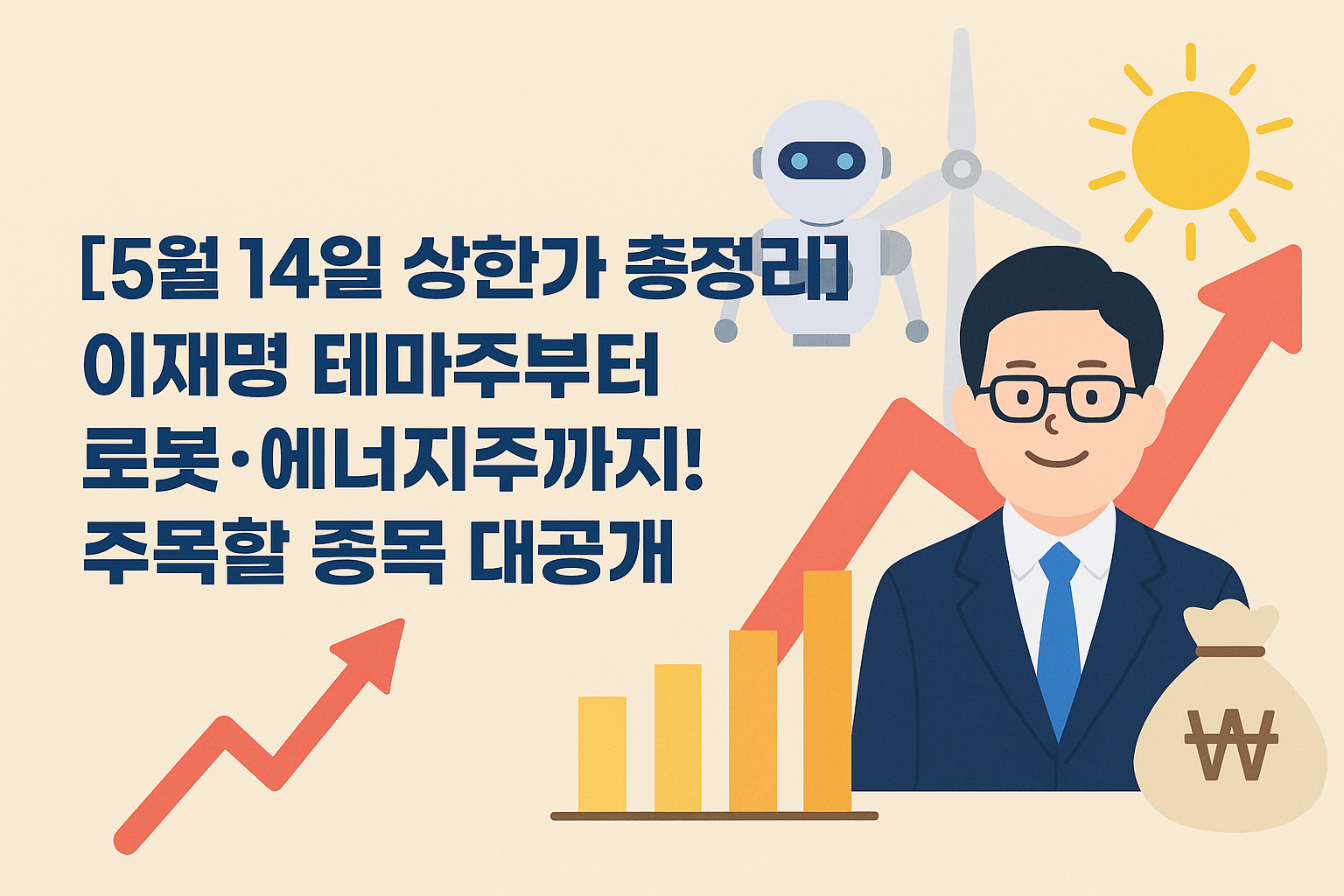 오늘(5월 14일)은 정치 테마주와 신재생에너지 관련주들이 강세를 보이며 시장의 중심에 섰습니다. 이재명 관련 정책 수혜 기대감, 로봇과 풍력 등 미래 산업 성장 모멘텀까지 다양한 이슈들이 종목별로 반영되었습니다.