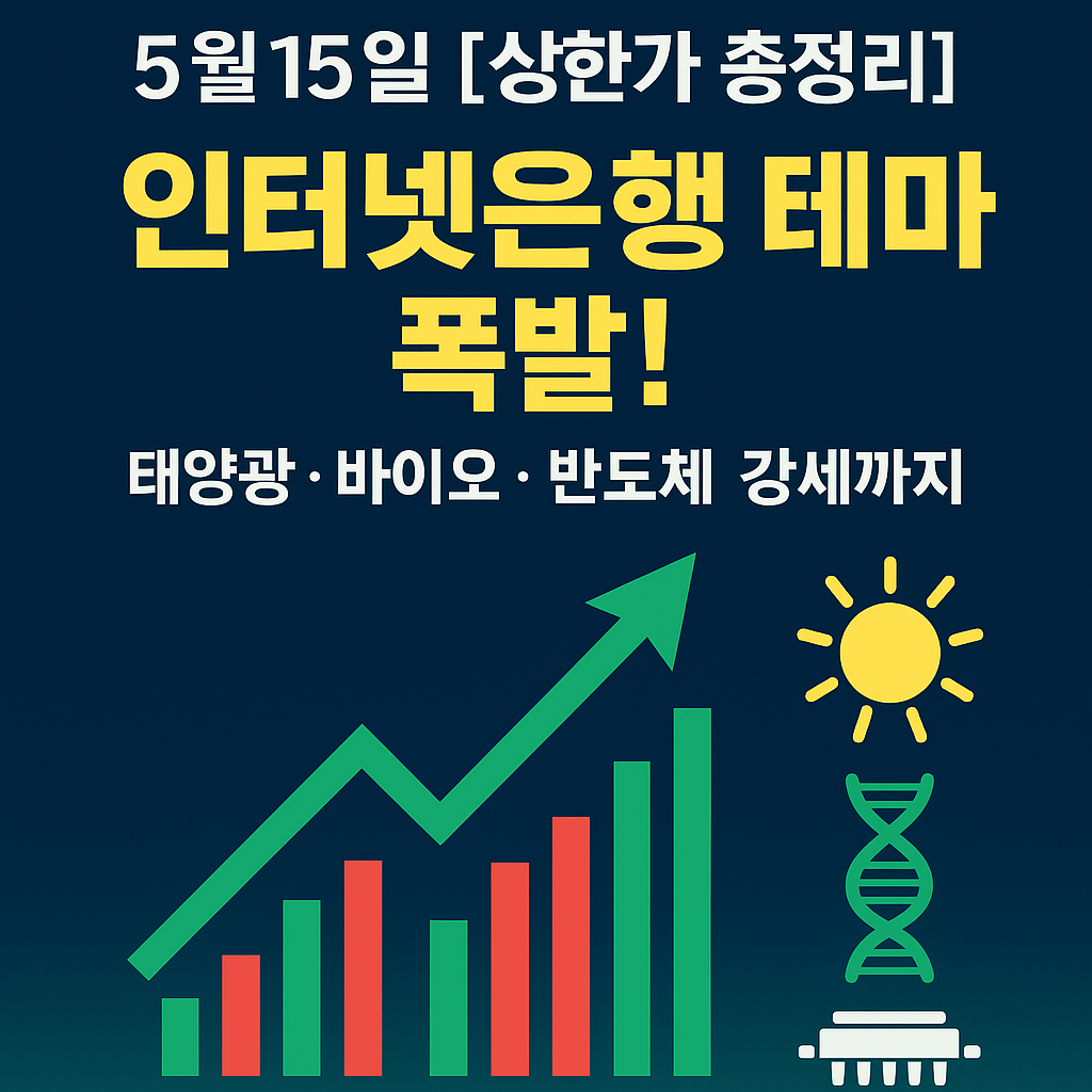 오늘(5월 15일)은 인터넷은행 관련 이슈가 중심에 섰고, 태양광·반도체·조선기자재·바이오 등 다양한 산업 섹터에서 강세 종목들이 등장하며 시장에 활기를 더했습니다.